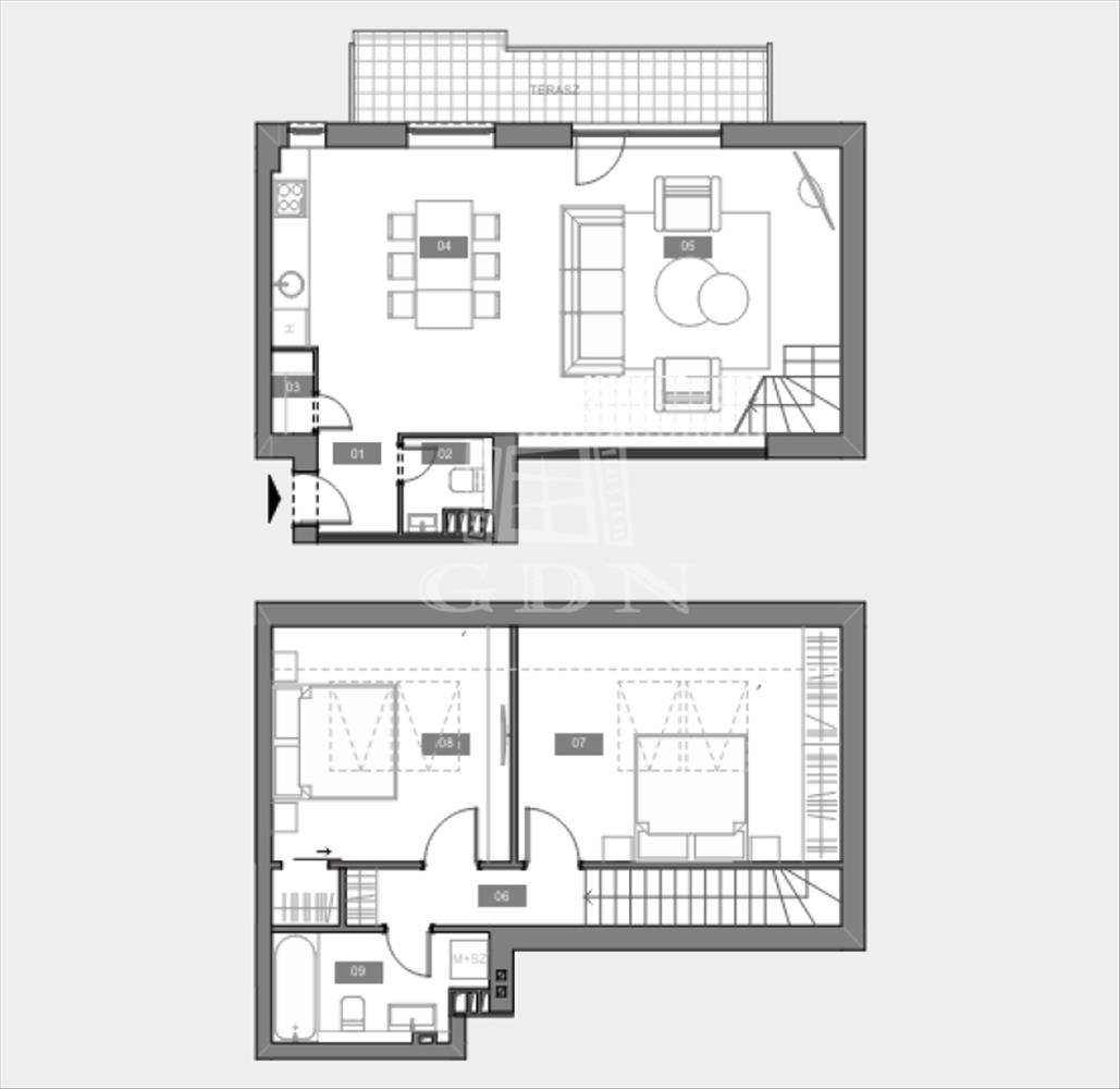 1. Lakás: belső kétszinten 94 nm-es + 8, 33 nm terasz, 2 szoba + nappalis,