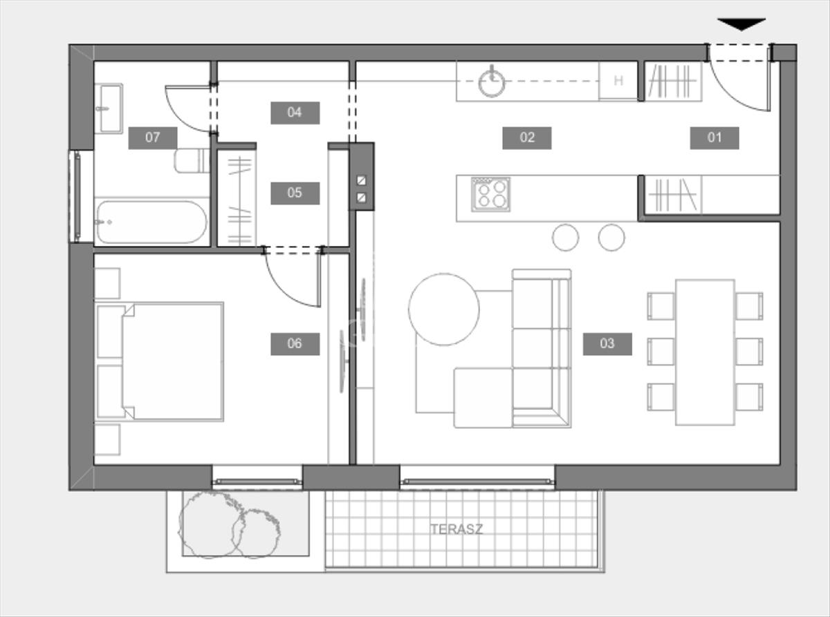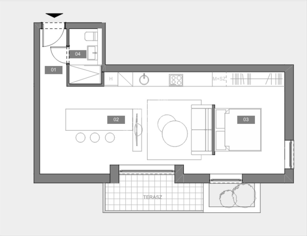 4. Lakás: 48, 13 nm-es + 6, 3 nm terasz, 1 szoba + nappalis,
