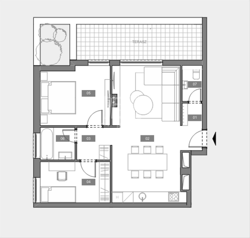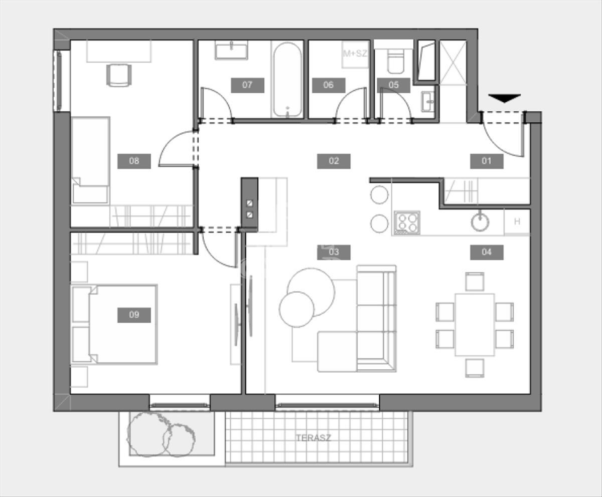 2. Lakás 'a terv ' alapján: 63, 36 nm-es + 13, 97 nm terasz, 2 szoba + nappalis,