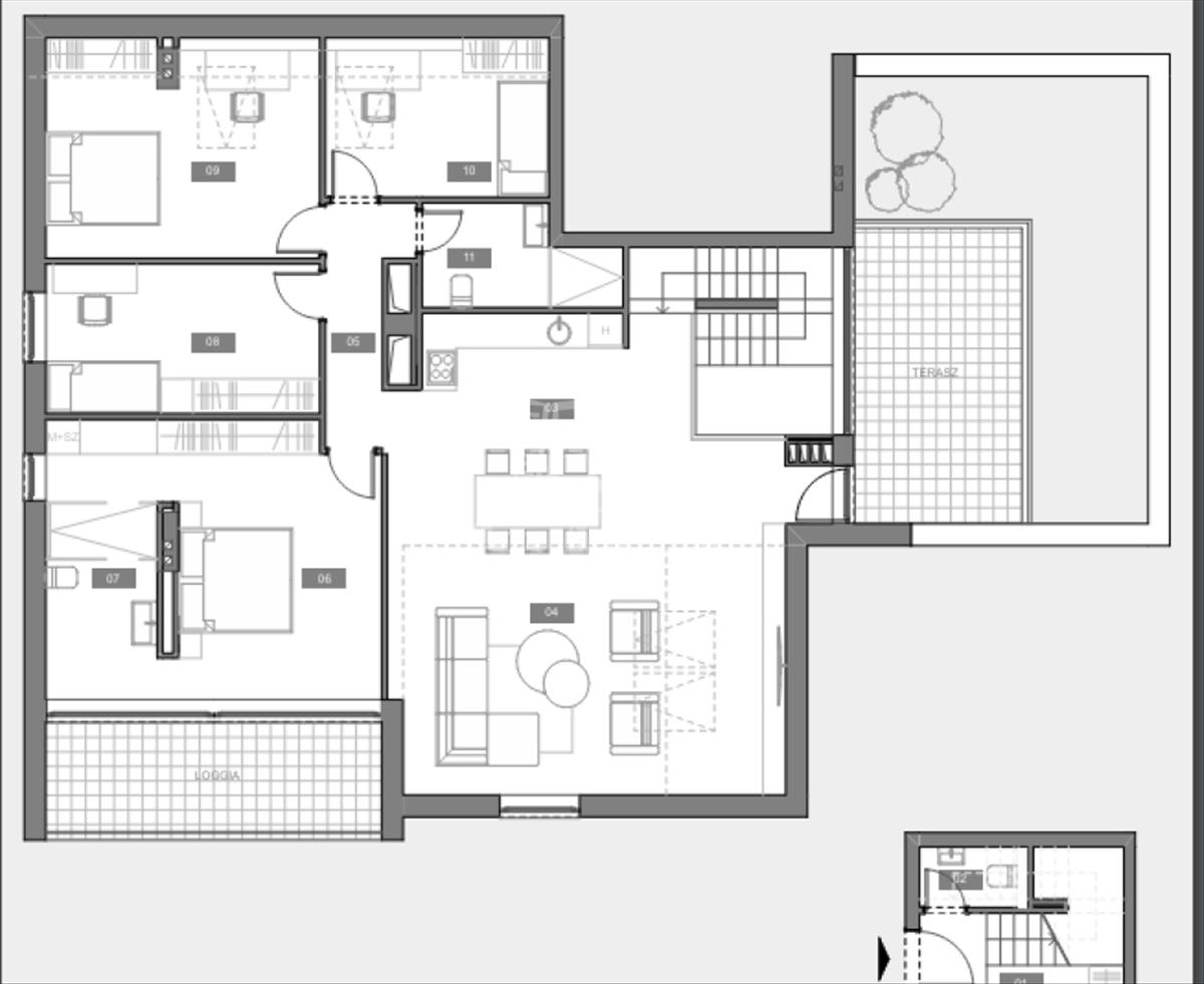 5. Lakás: penthouse jellegű: 128, 64 nm-es + 12, 07 nm loggia + 39, 88 nm tetőterasz + (80 nm zöld terasz), 4 szoba + nappalis+ dupla fürdőszobás.