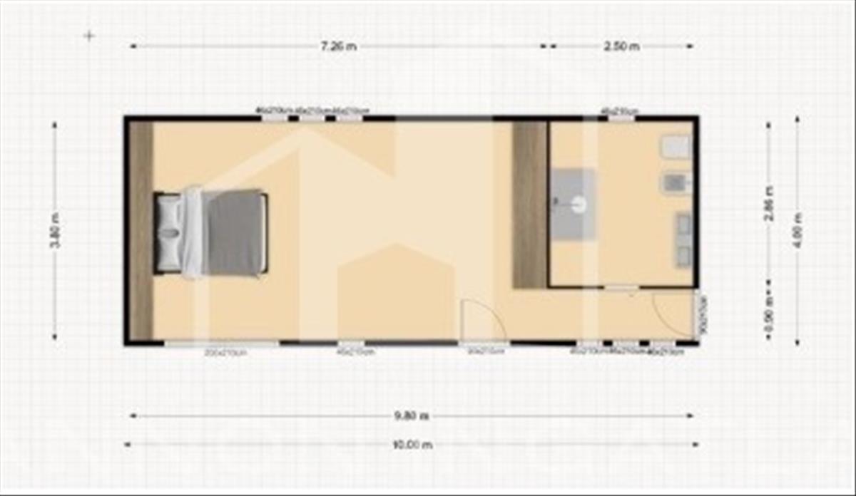 • a konténer a következő 2 helyiségből áll: szoba és fürdőszoba
