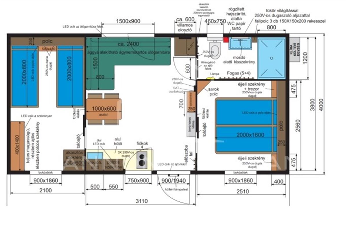 - Belső világítás, 250V-os konnektorok, villanykapcsolók, tv csatlakozó.