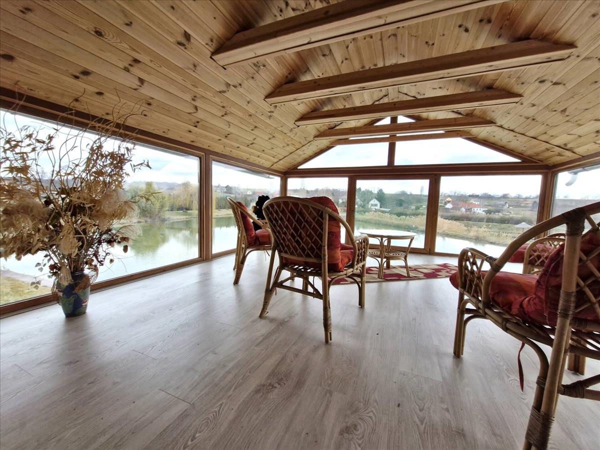 A főépület 2 szintes, az alsó akadálymentes, a nappaliból a tóparti teraszra juthatunk ki.