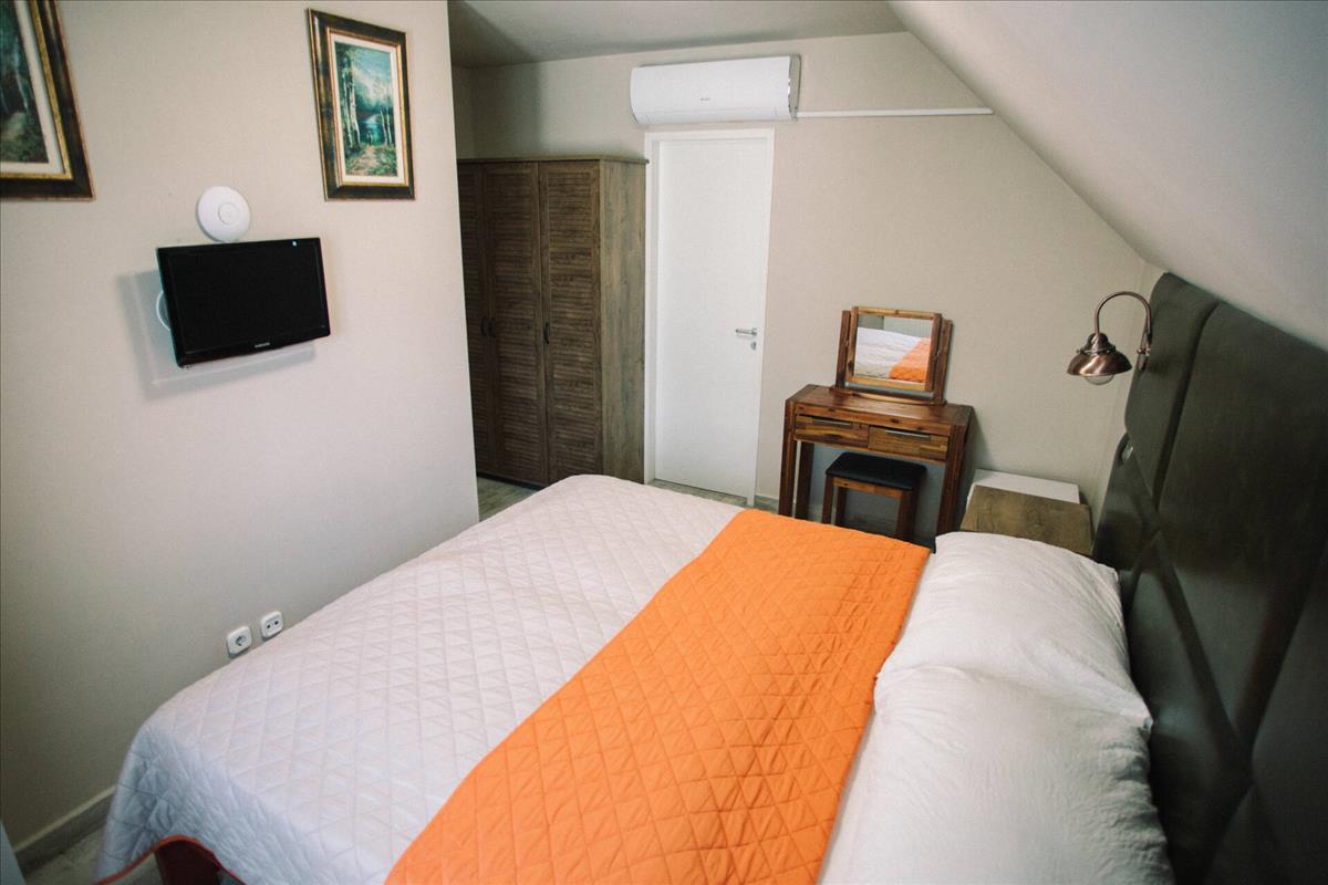 -az emeleten 1 db 4 személyes, teraszos apartman, szeparált hálóval, valamint további 6 db 2 ágyas szoba + 1 db stúdió apartman lett kialakítva