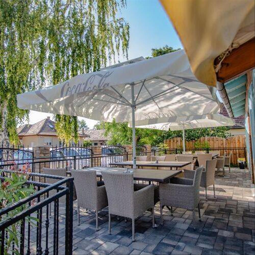 -az épület földszintjén helyezkedik el a tágas étterem, fedett teraszokkal