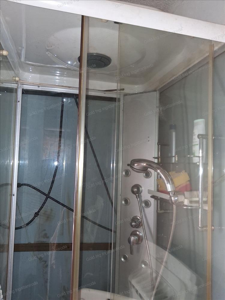 A fürdőszobát a konyhából rekesztették le egy könnyűszerkezetes fallal, ami igény szerint áthelyezhető, könnyen bővíthető. a fürdőt hidromasszázs zuhanykabinnal szerelték fel. Ennek a helyiségnek is van külső ablaka, így jól szellőzik.
