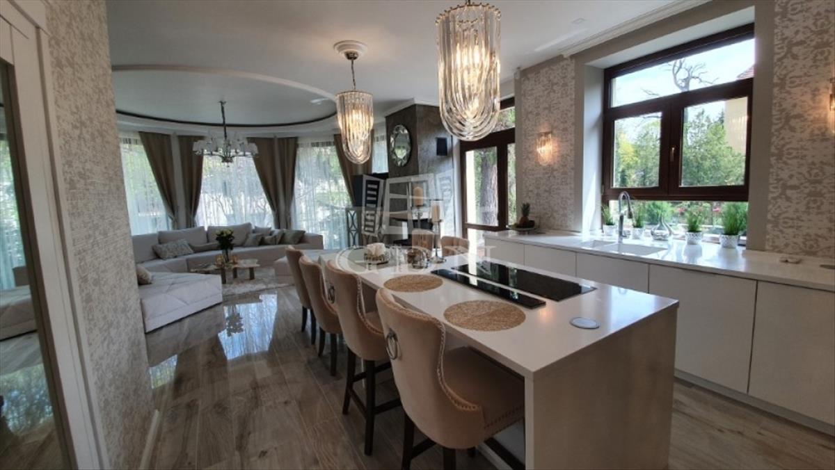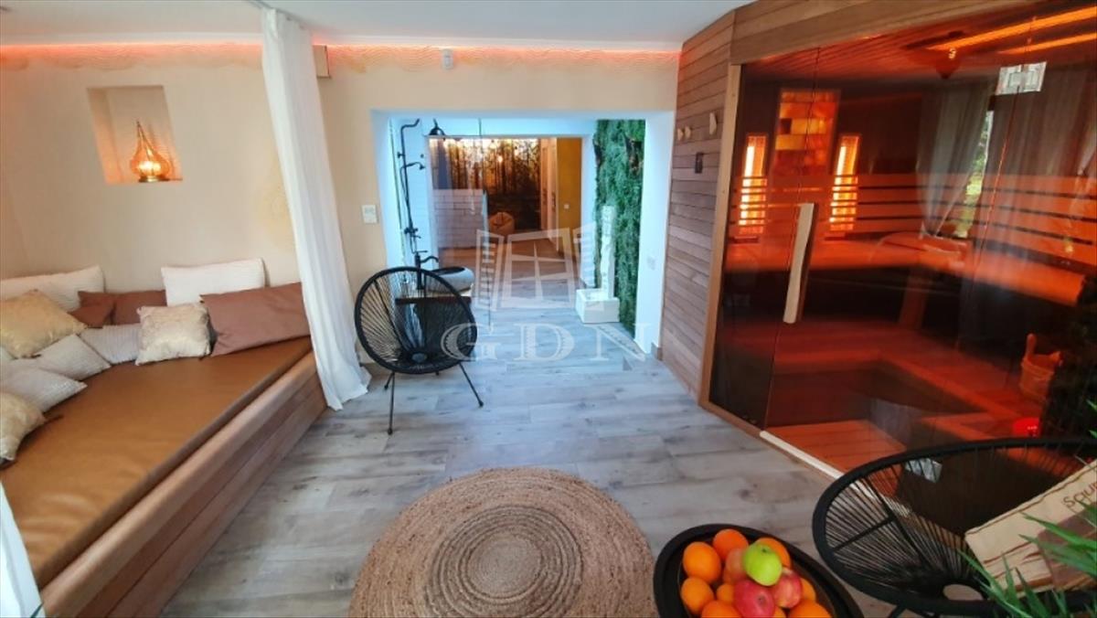 padló és fal fűtés - hűtés, hőszivattyús szellőzés, 3 rétegű fa hatású műanyag nyílászárók, távirányítós elektromos redőnyök, 2 kandalló, riasztó szintenkénti riasztási lehetőséggel, óriási térhatású led háttér világítás, beépített konyhabútor gépekkel - mosogatógép, rejtett pultból emelkedő páraelszívó, sütő, főzőlap, borhűtő, kerti automata öntözőrendszer, kültéri automata hangulatvilágítás, kombinált finn - infra szauna.