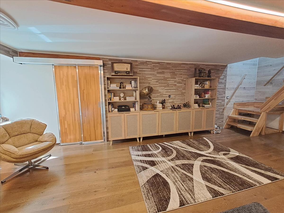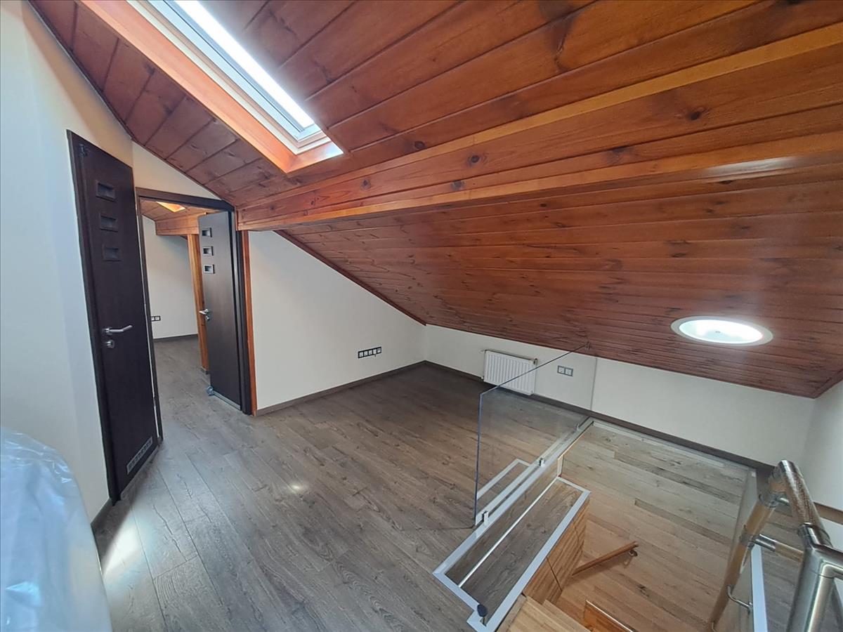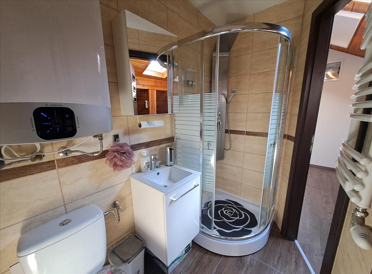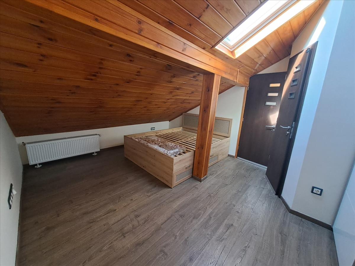 A padlásterében hálószoba, közlekedő és zuhanyzós fürdőszoba található.