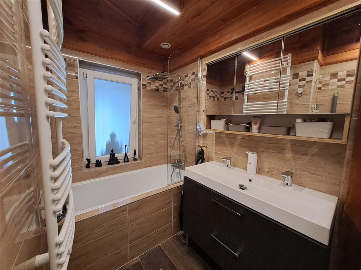 A közlekedőből felújított kádas fürdőszoba, leválasztott mosdó helyiséggel.