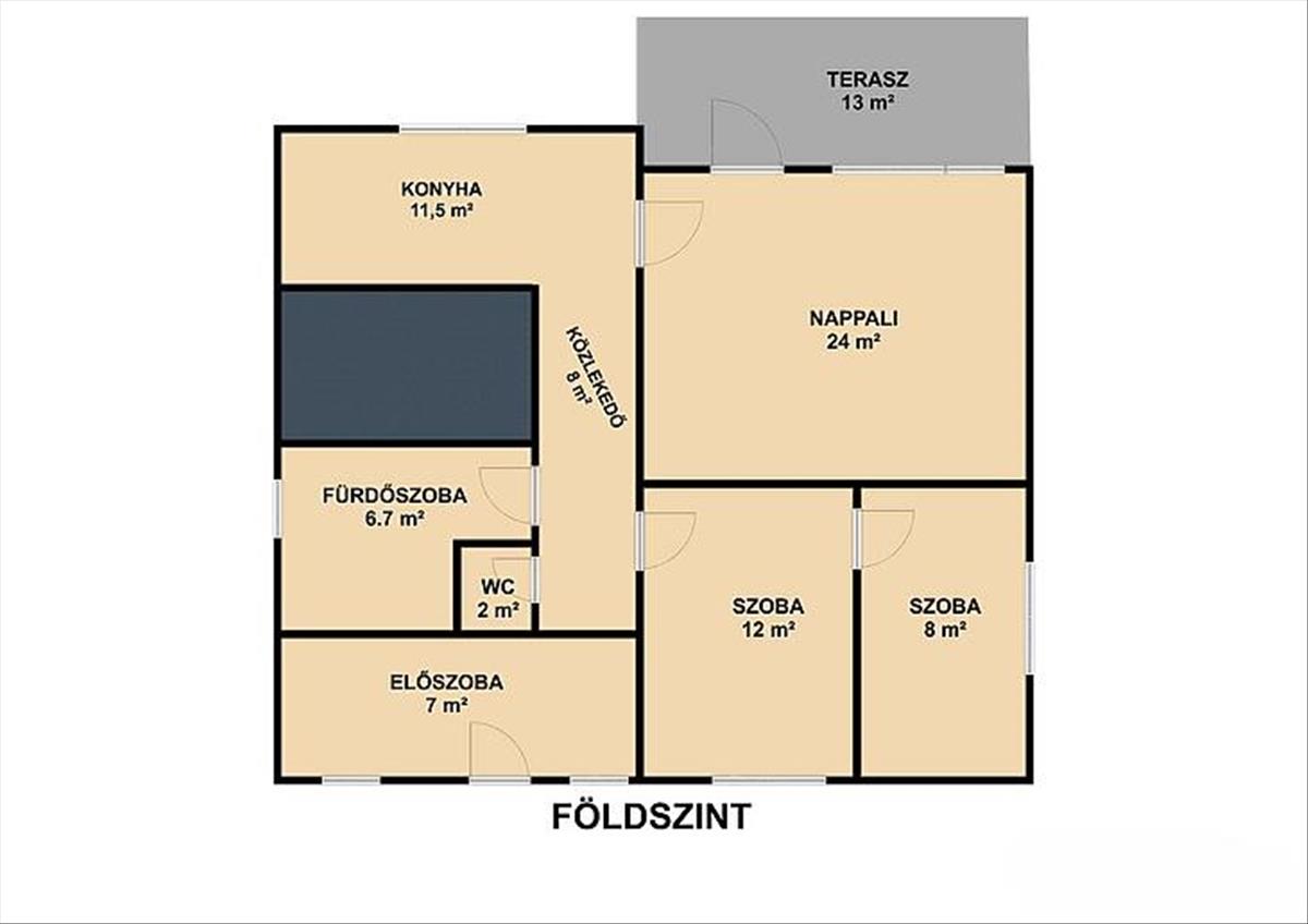 Földszint: 3 szoba, konyha, előszoba, kádas fürdőszoba, kertkapcsolatos terasz.