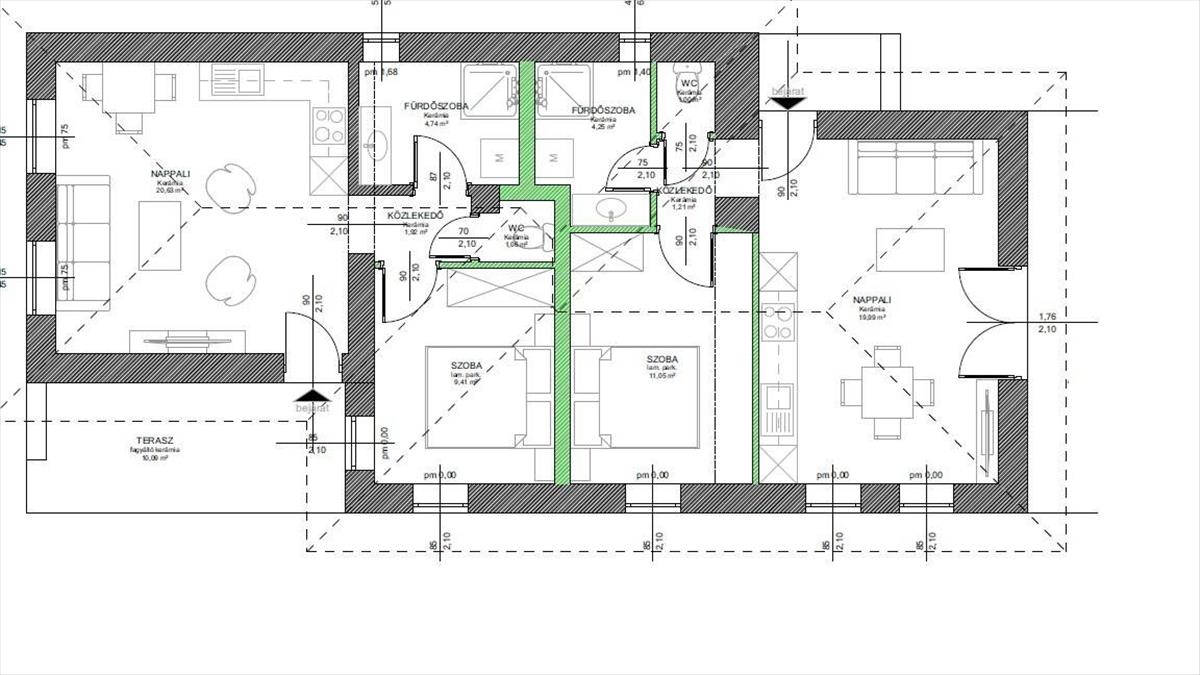 Lakások amerikai konyhával + 1 hálószobával, zuhanyzós fürdőszobával és különálló wc helyiséggel rendelkezik. a két lakásnak különálló kert része és külön beállási lehetősége van. Kerítés wpc kerítéselemekkel lesz ellátva.