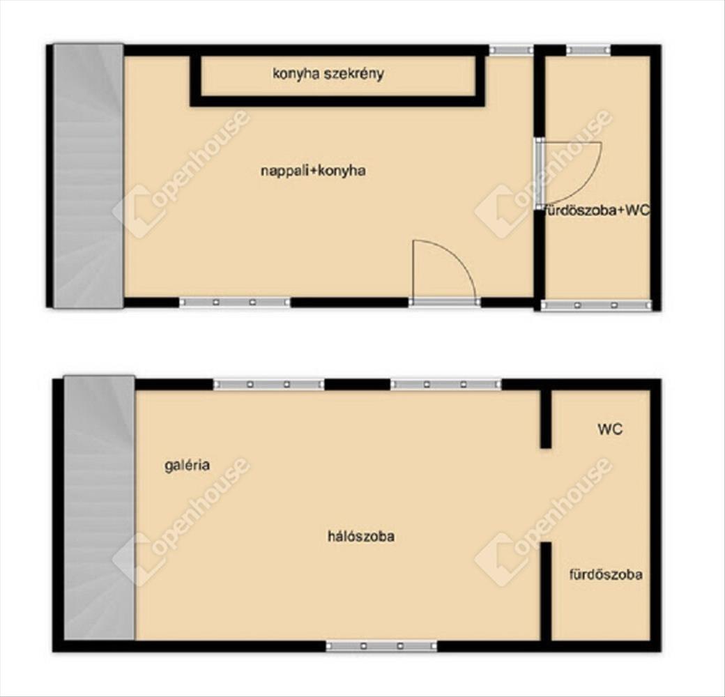 - a házban a nappali, konyha egy légtérben helyezkedik el, fürdőszoba wc egy helységben található.