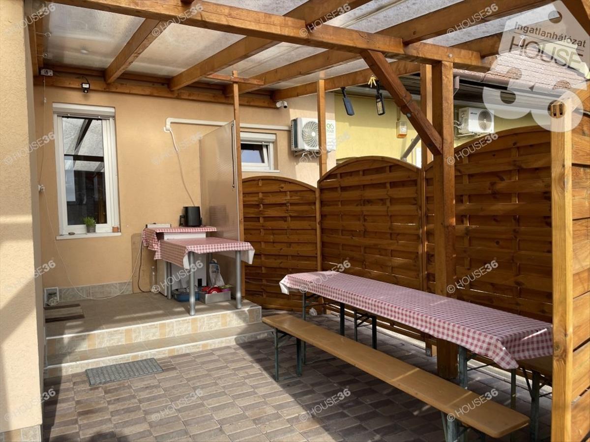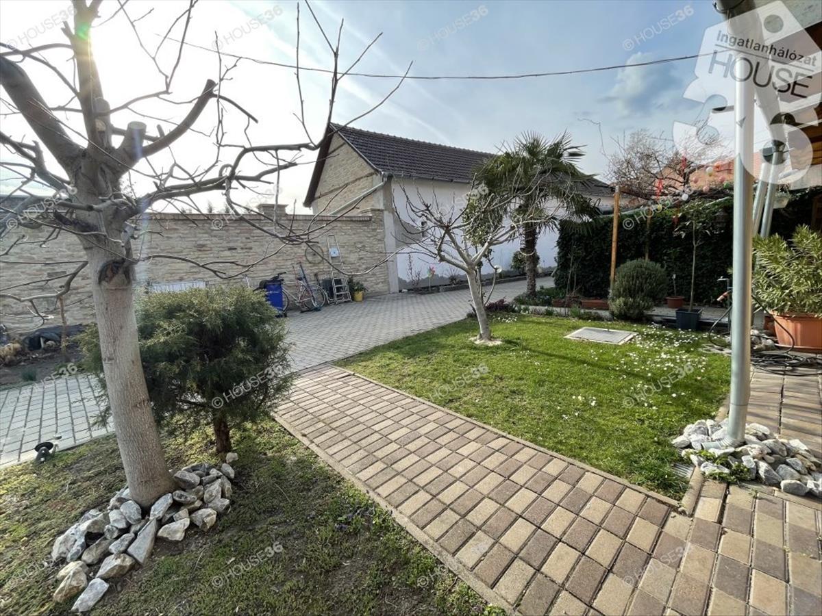 Gyönyörű rendezett udvarral, önálló járólapozott 30 m2-es pincével, egy fedett és egy kisebb autó tárolására alkalmas gépkocsi beállóval.