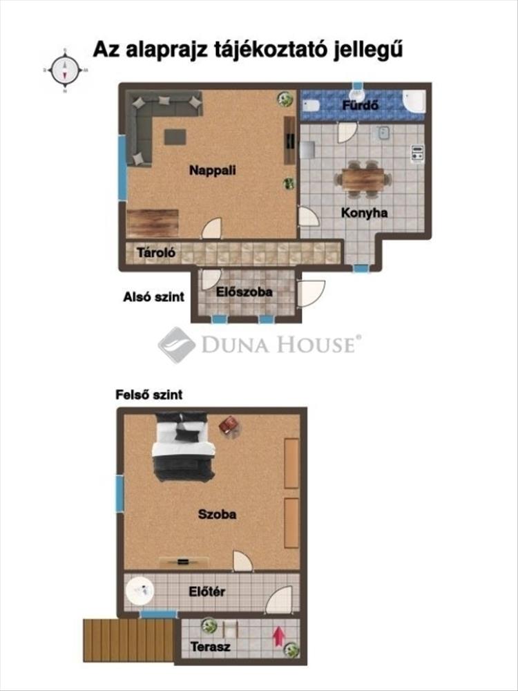 Az alsó szinten egy szoba, konyha, fürdőszoba, előszoba és tároló található, míg a felső szinten egy kis előtérből nyíló szoba és egy hangulatos terasz biztosítja a kényelmes életteret. a felső szint jelenleg fűtetlen, az alsó szinten fatüzelésű kandalló gondoskodik a melegedésről.