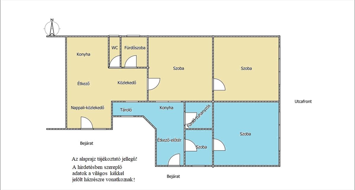 - a telken három házrész található, melyből kettő eladó. Az alaprajzon a kékkel jelölt ingatlanra vonatkoznak a hirdetés adatai.
