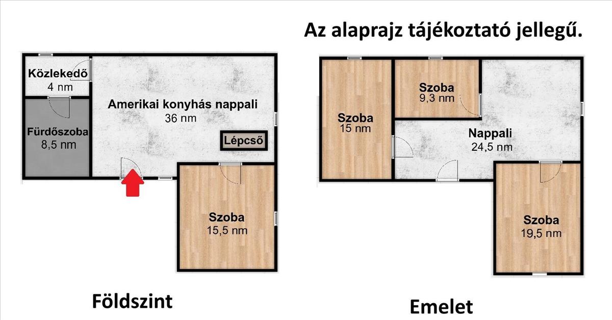 - Földszint: előszoba, étkező-konyha, nappali, hálószoba, kádas fürdőszoba