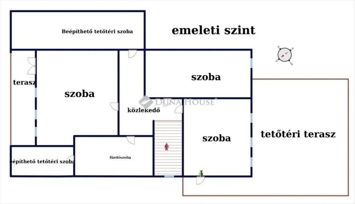 Az emeleten lehetőség van a 3 szobán kívül még 2db hálószobát kialakítani.