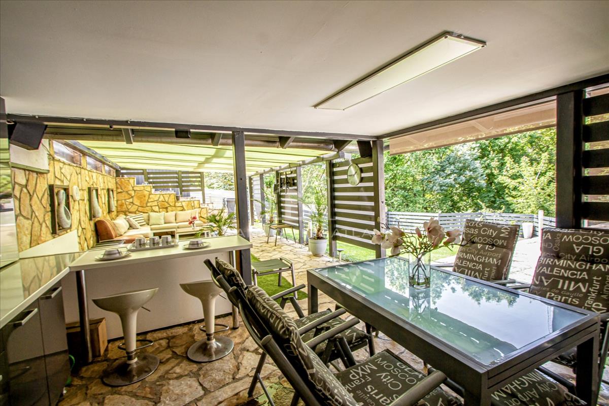 A kerti konyha modern kialakítású, beépített szekrényekkel és étkezőasztallal rendelkezik, így tökéletes helyszín családi ebédekhez, baráti összejövetelekhez.