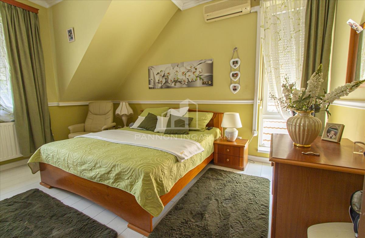 Az emeleti lakrész egy különálló, gondosan kialakított élettér, ahol a klasszikus stílus és a természetes anyagok harmonikus egységet alkotnak.