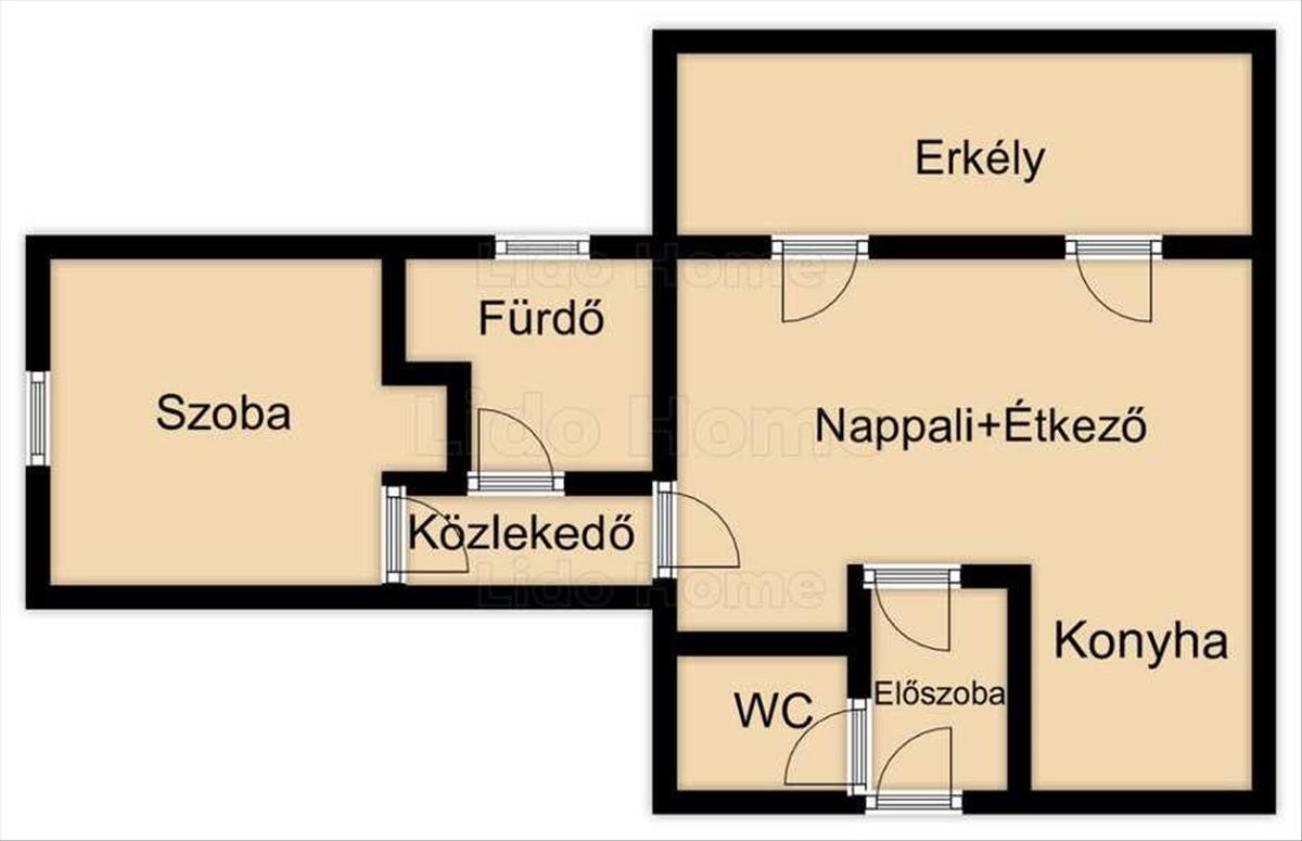 - Egy szoba, egy konyha-étkező, egy zuhanyzós fürdőszoba+WC, és egy előszoba került kialakításra, továbbá tartozik az ingatlanhoz egy 12 m2-es erkély is