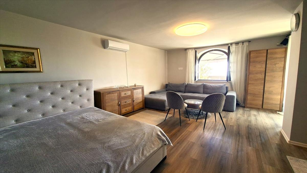 Téliesített, ízlésesen felújított nyaraló fedett tetőterasszal – mert a jó döntésekhez néha kell egy pohár bor és egy ilyen panoráma.
