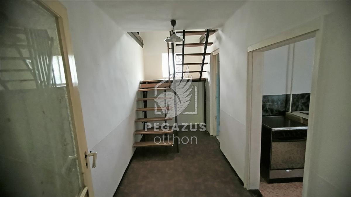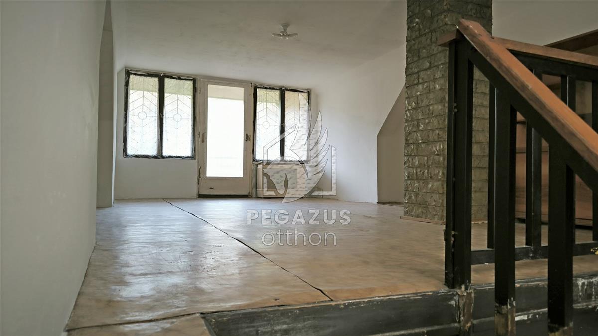 Alsó szint: Egy kisebb szoba, két nagyobb, összenyitható helyiség, konyha és egy felújítandó fürdőszoba.