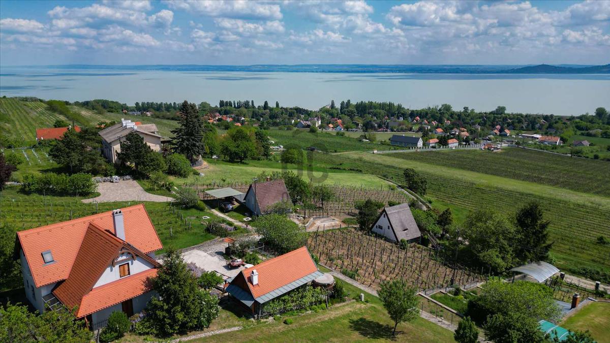 A szőlődűlők között fekvő ingatlan páratlan panorámát nyújt a balatonra és a környező TANÚHEGYEKRE!