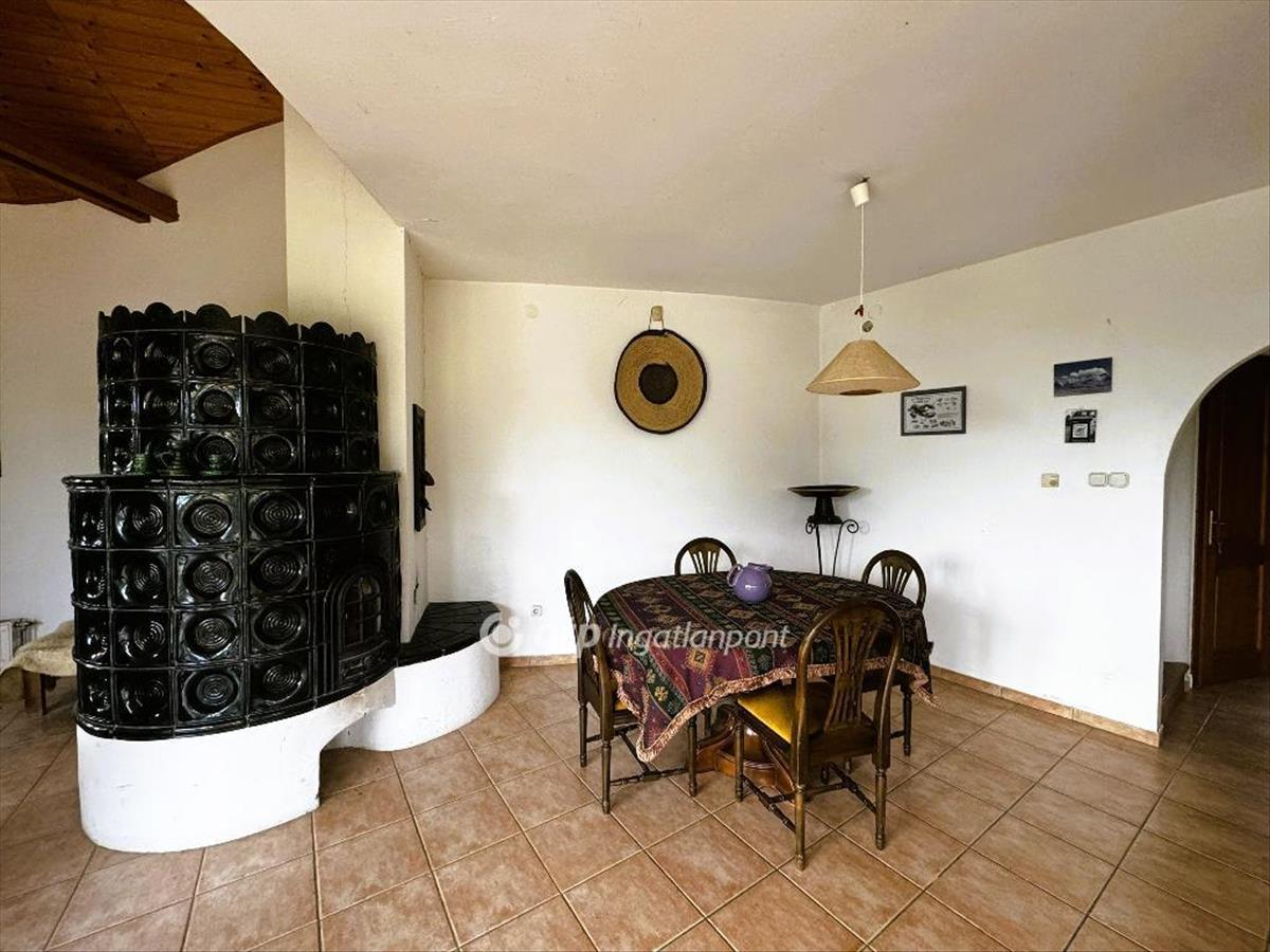 A nappali különlegessége a szemet gyönyörködtető zöld cserépkályha, a vörösfenyő szerkezetek pedig végig meghatározzák a ház hangulatát.