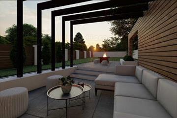 -A földszinten egy világos, tágas amerikai konyhás nappali került kialakításra, amely közvetlenül kapcsolódik a részben pergolával fedett, nagy méretű teraszhoz. Egy ízlésesen kialakított fürdőszoba kapott még helyet a földszinten.
