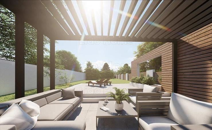 -A földszinten egy világos, tágas amerikai konyhás nappali került kialakításra, amely közvetlenül kapcsolódik a részben pergolával fedett, nagy méretű teraszhoz. Egy ízlésesen kialakított fürdőszoba, valamint egy jól elhelyezett tároló/műhely kapott még helyet a földszinten.