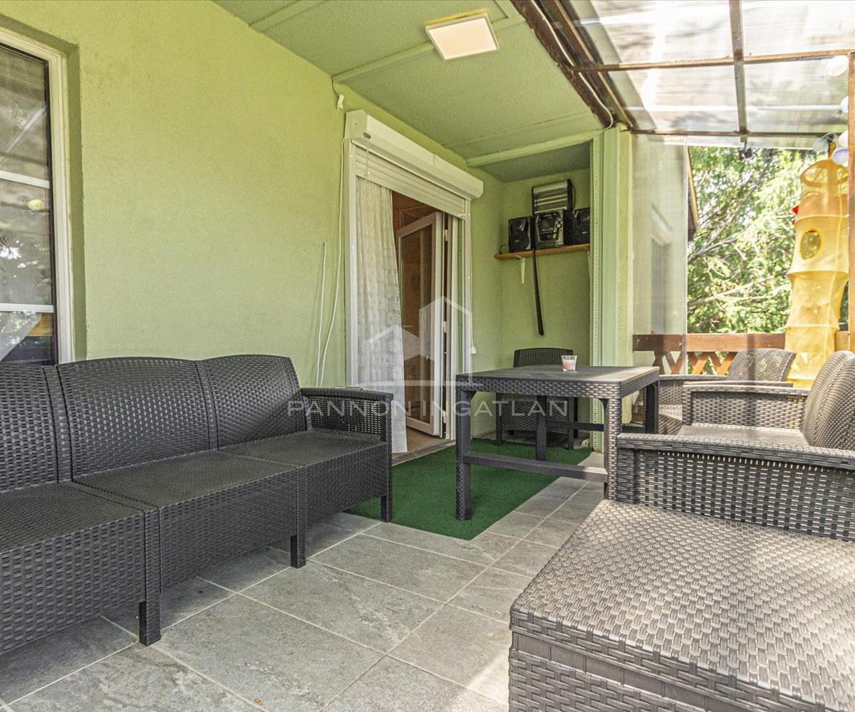 - amerikai konyhás nappali (melynek üvegportálos részét kinyitva, a ház előtti terasszal egy egységet képezhetünk - ezzel megnövelve a nyári piheőrészt - zuhanyzó, illemhelyiség és 2 hálószoba található. Ebben a lakásban mobil-klíma került beépítésre.