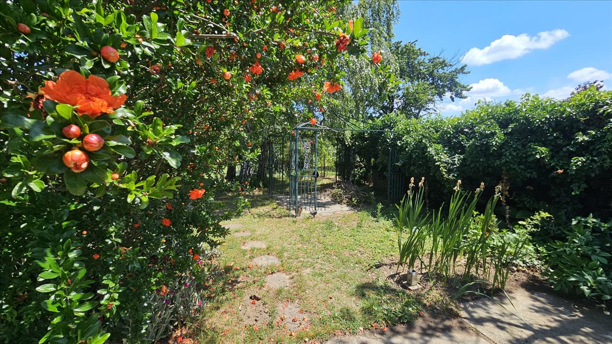 A gondosan kialakított udvart gyümölcsfák, rózsák és nagy árnyékot adó fák díszítik, intim, nyugodt hangulatot teremtve.
