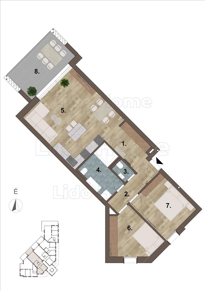 - előtér, tágas amerikai konyhás nappali, két szoba, közlekedő, fürdőszoba, külön mellékhelyiség kiosztású,