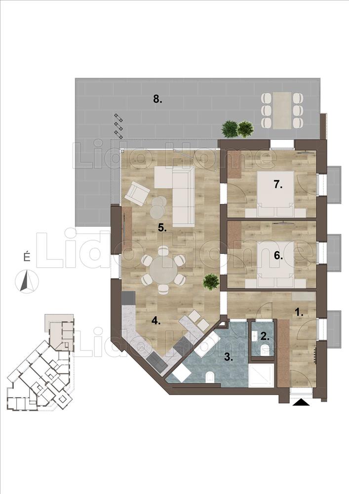 - előtér, tágas amerikai konyhás nappali, két szoba, közlekedő, fürdőszoba, külön mellékhelyiség kiosztású,