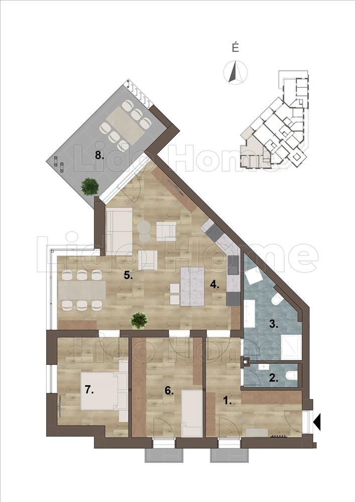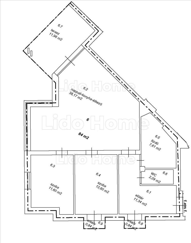 - előtér, tágas amerikai konyhás nappali, két szoba, közlekedő, fürdőszoba, külön mellékhelyiség kiosztású,