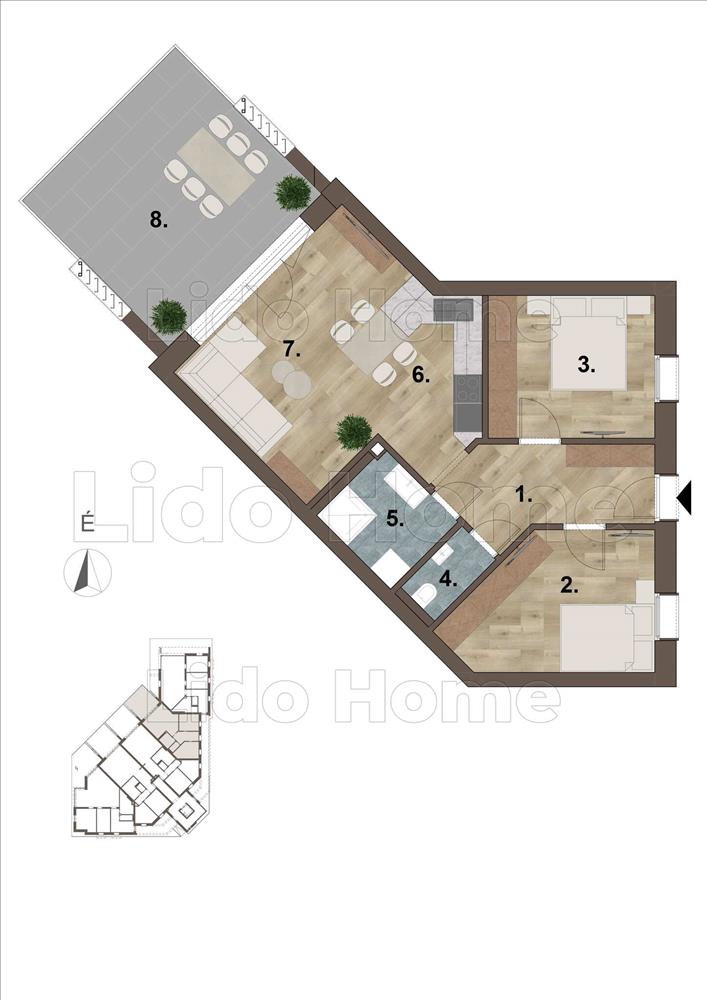- konyha-előtér, tágas amerikai konyhás nappali, két szoba, közlekedő, fürdőszoba, külön mellékhelyiség kiosztású,