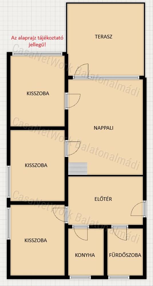 - előszoba, nappali, három kisszoba, konyha, fürdőszoba és toalett, terasz