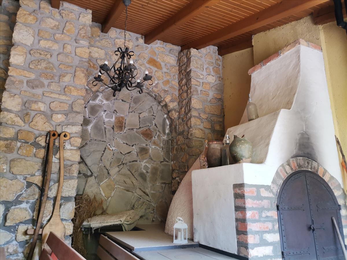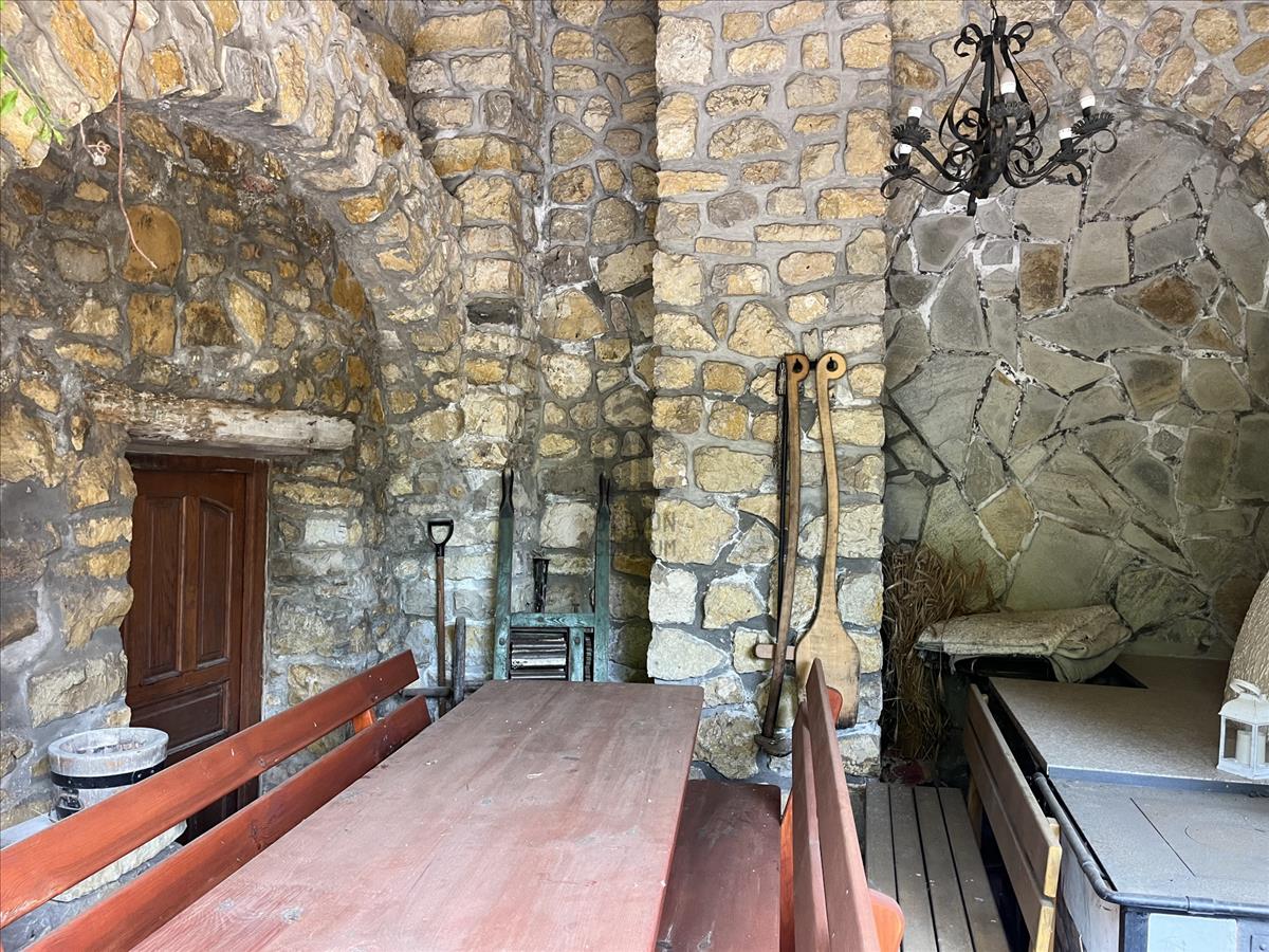 Egy kerti, fedett étkező-kiülő részben (15 nm) folytatódik a kis ház, ahol búbos kemencében lehet az esti lakomákat sütni, és a borospince (8 nm) hűvöséből kínálni a bort.