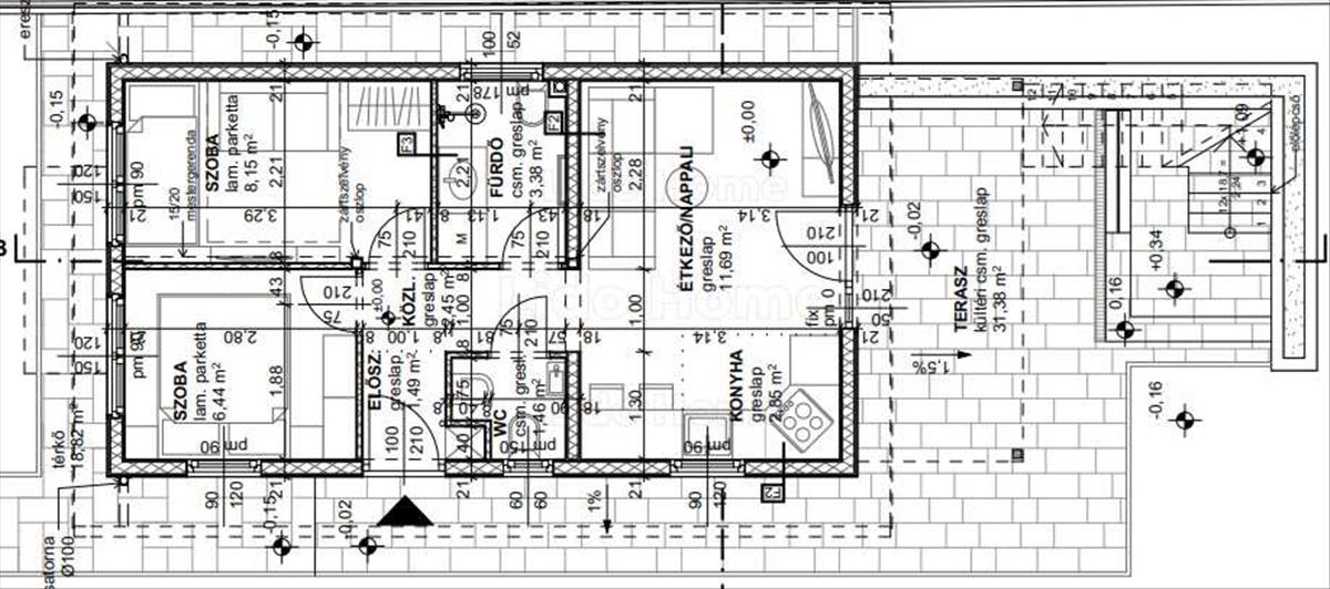 A földszinten teraszkapcsolatos nappali–konyha, két szoba, fürdőszoba és külön wc került kialakításra.