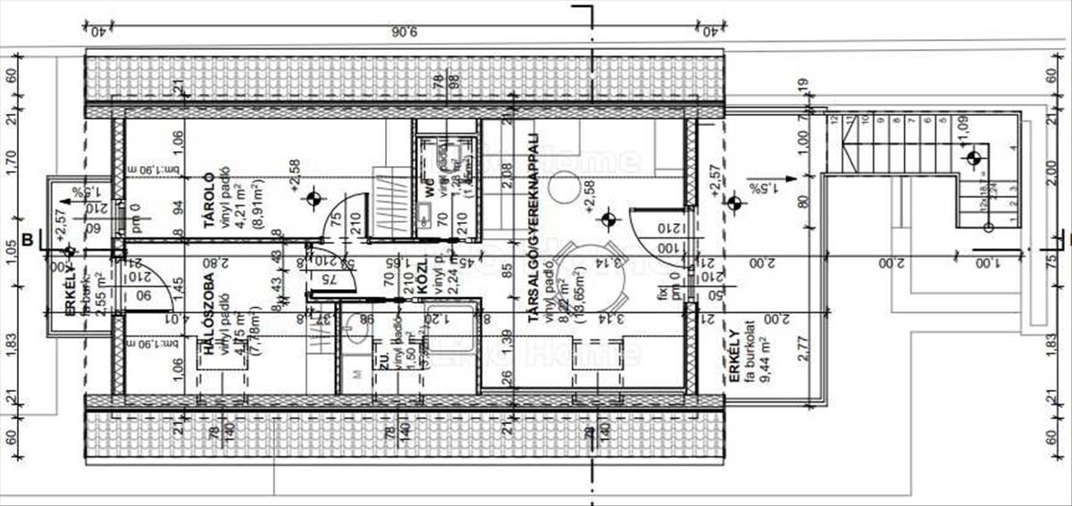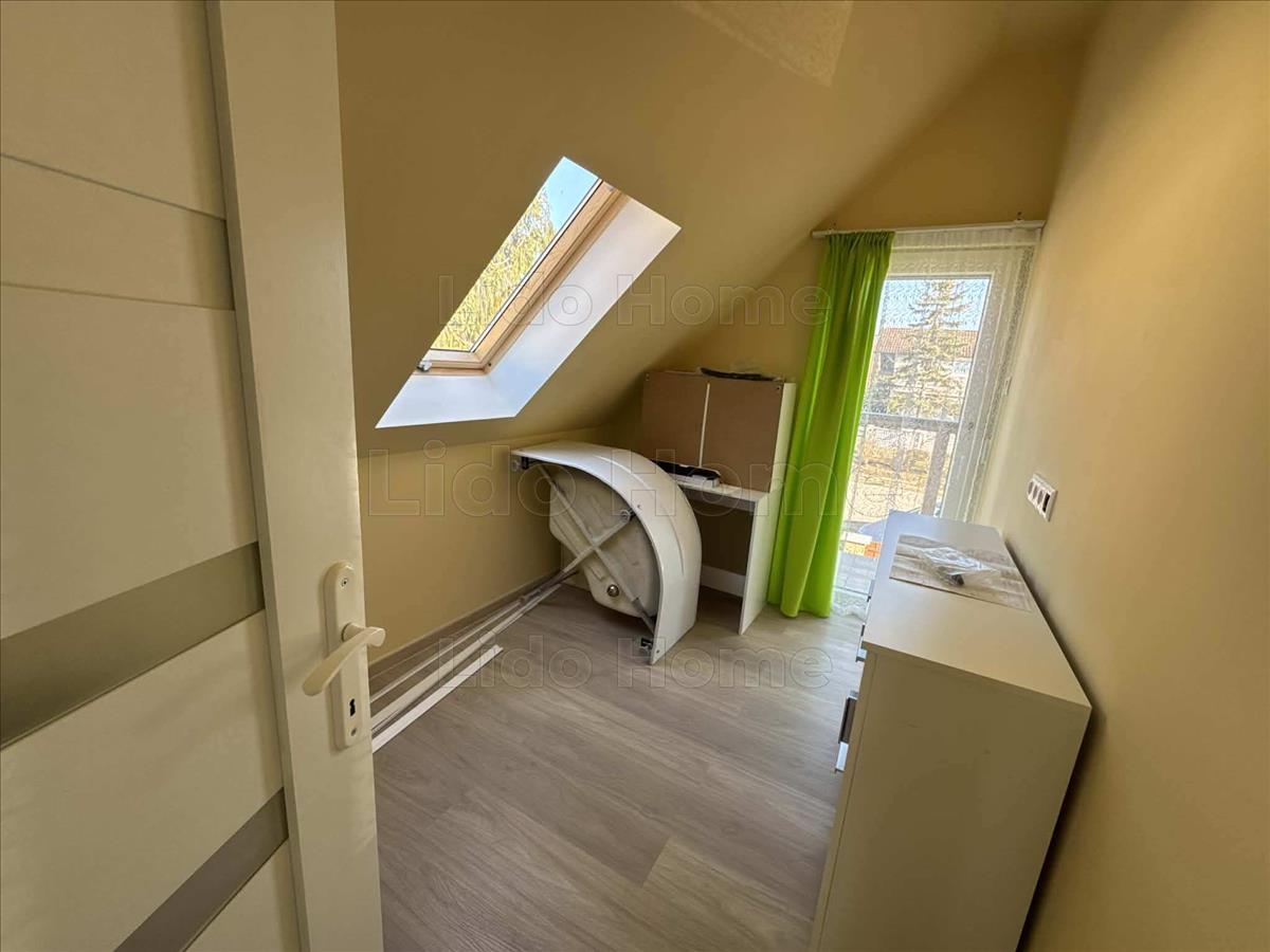 A tetőtér külső feljárón közelíthető meg, elrendezése megegyezik a földszinttel: nappali–konyha, két szoba, fürdőszoba és külön WC.
