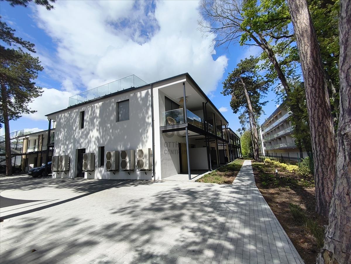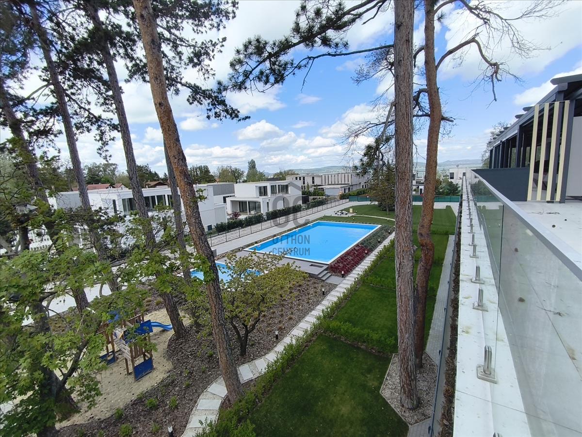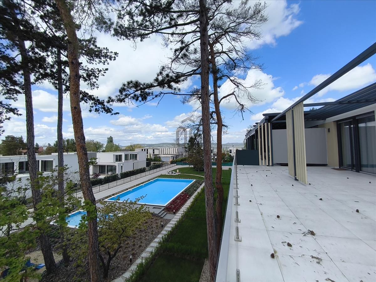 A lakás 29 lakásos, a+ energia besorolású társasházban található, a 2. emeleten, a penthouse szinten. Az épület tervezésénél a funkcionalitás mellett fő szempontok voltak az egyszerűség, az elegancia, a harmónia és a modernitás, ezek mellett a kedvező megközelítés, tájolási és panoráma adottságok kihasználása is. a lakóparkban felnőtt illetve gyermek medence is kialakításra került. Az ingatlan téglából épült, szigetelt, lapos tetős épület.