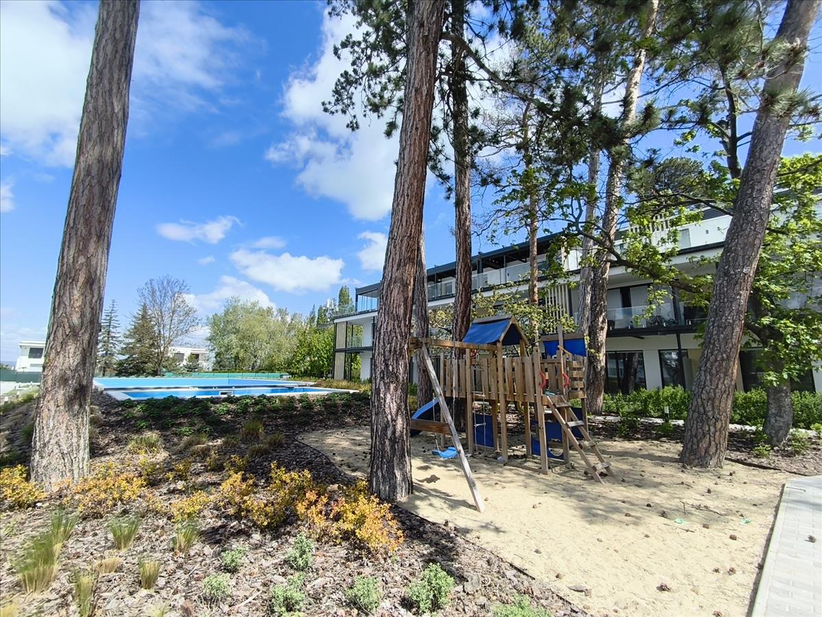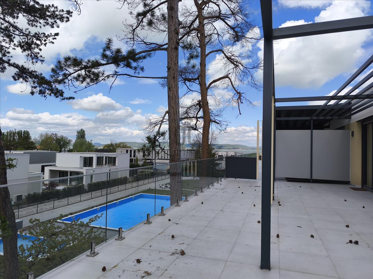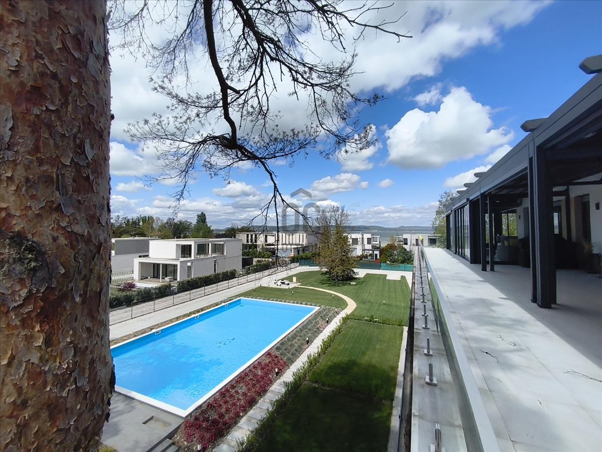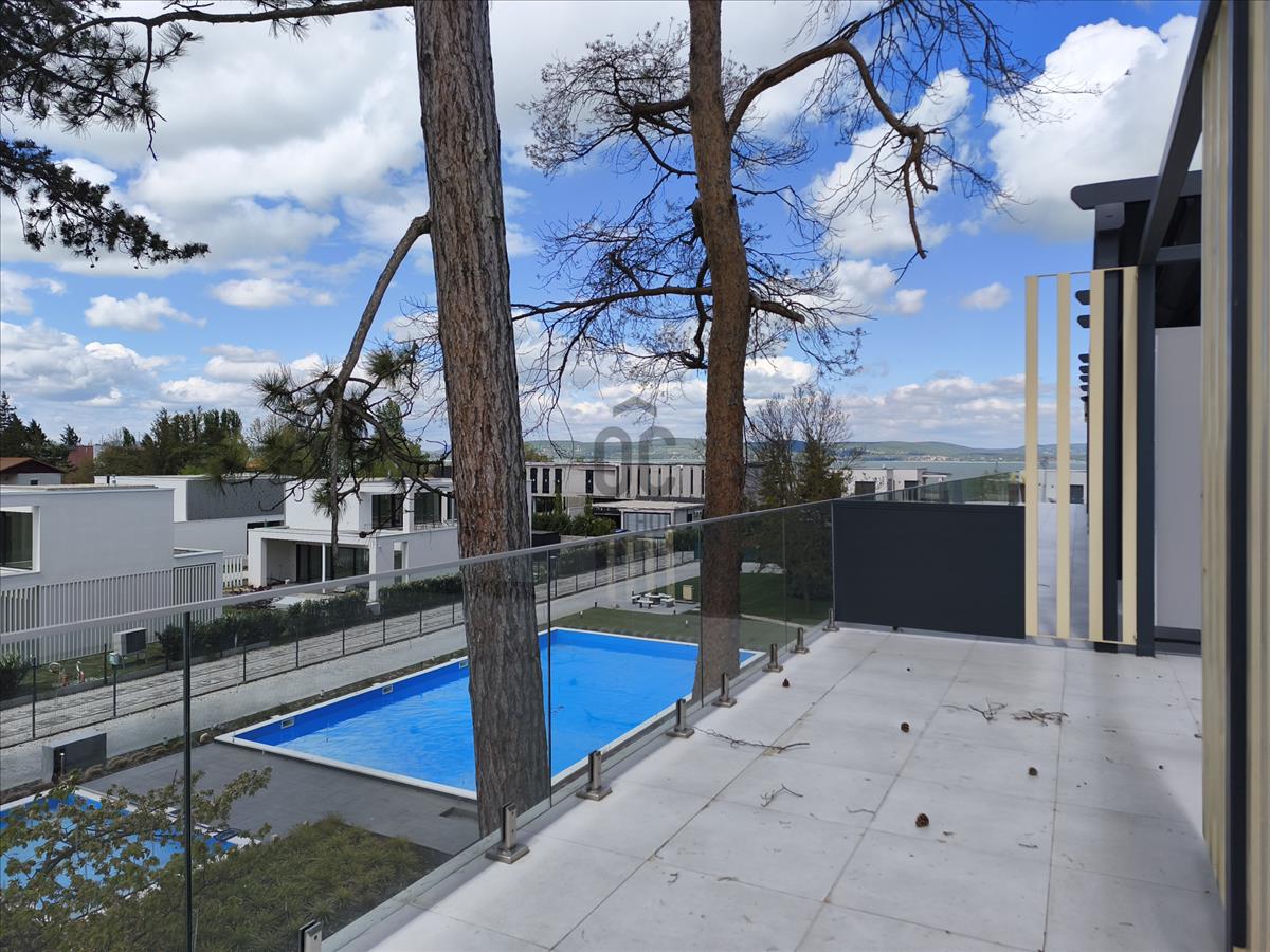 Balatonlellén, vízparti ősfás környezetben, új építésű, 78 m2-es penthouse, luxus lakás 68, 18 m2-es terasszal, balatoni panorámával, komplett berendezéssel, 2 db felszíni parkolóval eladó.