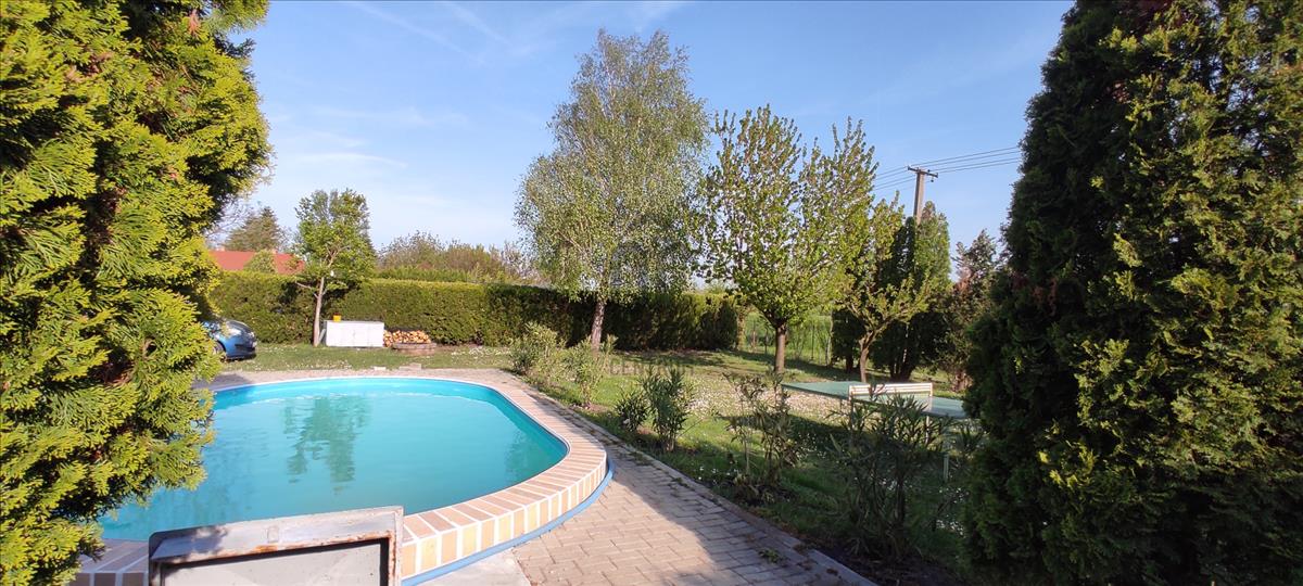 A gyönyörűen parkosított, ideális méretű telek bőtermő gyümölcsfákkal és szőlővel van beültetve. a nagyméretű (44 nm) burkolt napozóterasz közepén korszerű homokszűrős gépészettel ellátott ovális medence teszi pihentetővé a nyaralást.