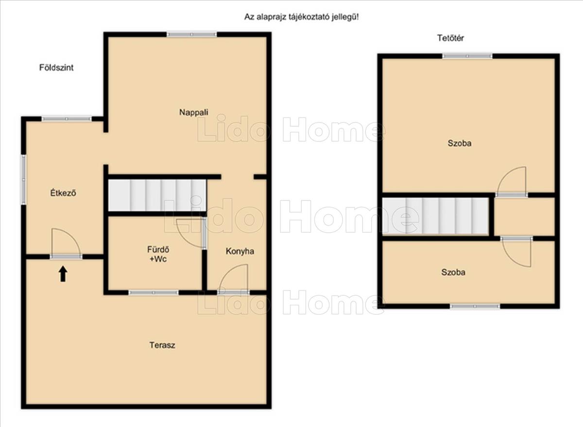 -Földszint: nappali, konyha, fürdőszoba, előszoba.
