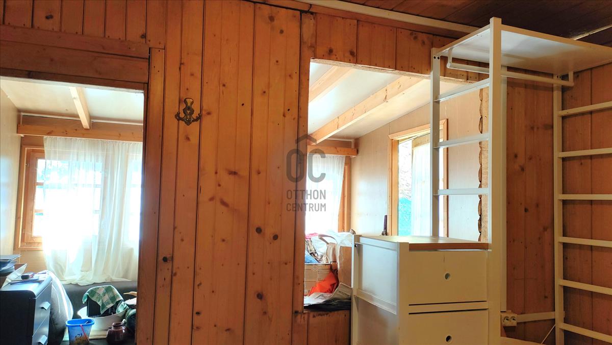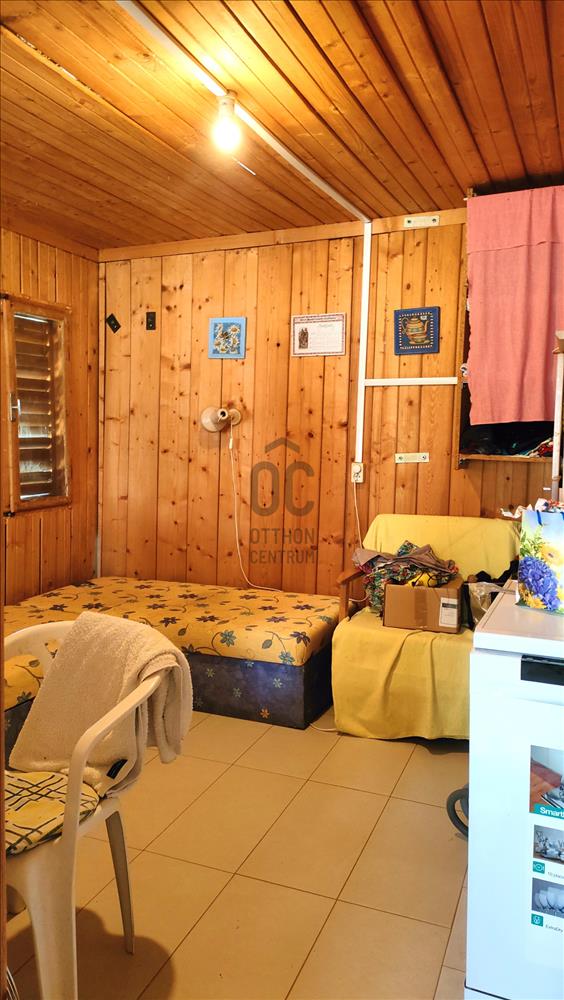 Az 1980-as években téglából épült, 12, 5 m²-es kis ház egy 10 m²-es, a közelmúltban felújított szobát foglal magába, amely letisztult, világos térként szolgál pihenésre. Hozzá külön bejárattal egy 2, 5 m²-es fürdőszoba csatlakozik. a másik épület egy összesen 21, 5 m²-es faház, amelybe belépve egy 7, 7 m²-es nappaliba érkezünk, innen nyílik a 9, 5 m²-es lakószoba – egyszerű, de barátságos elrendezéssel. Külső megközelítéssel érhető el az ugyancsak könnyűszerkezetes, 3, 3 m²-es főzőhelyiség, valamint az 1 m²-es toalett, így a funkciók jól elkülönülnek, mégis egységet alkotnak.