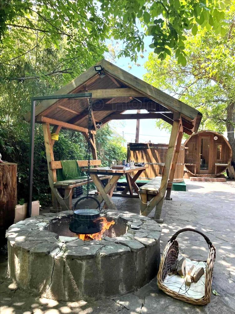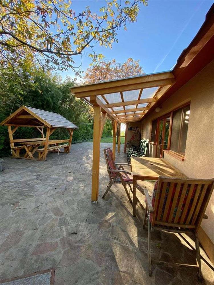 A telken található még egy fedett kerti kiülő, főző és sütögető hely, dézsafürdő, hordószauna és egy tároló. . Az udvar nagy része térkövezett.