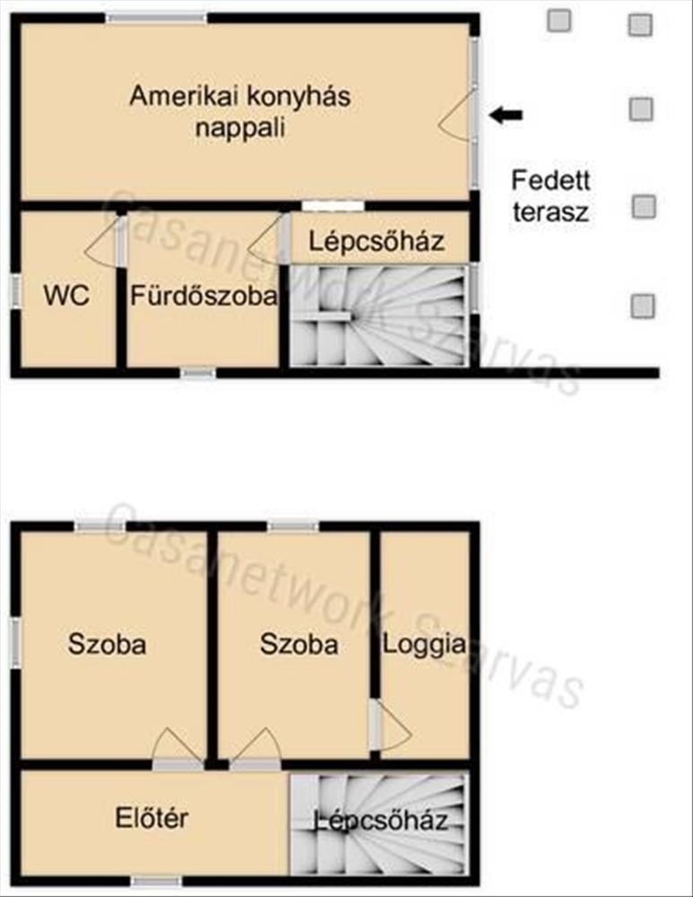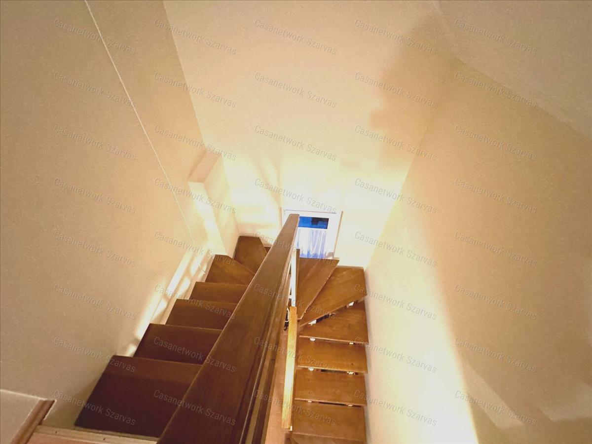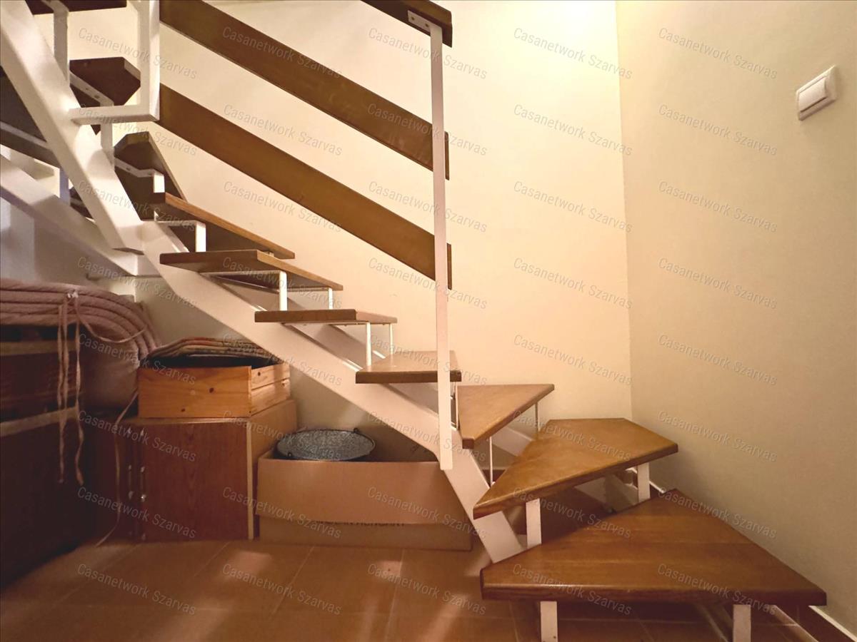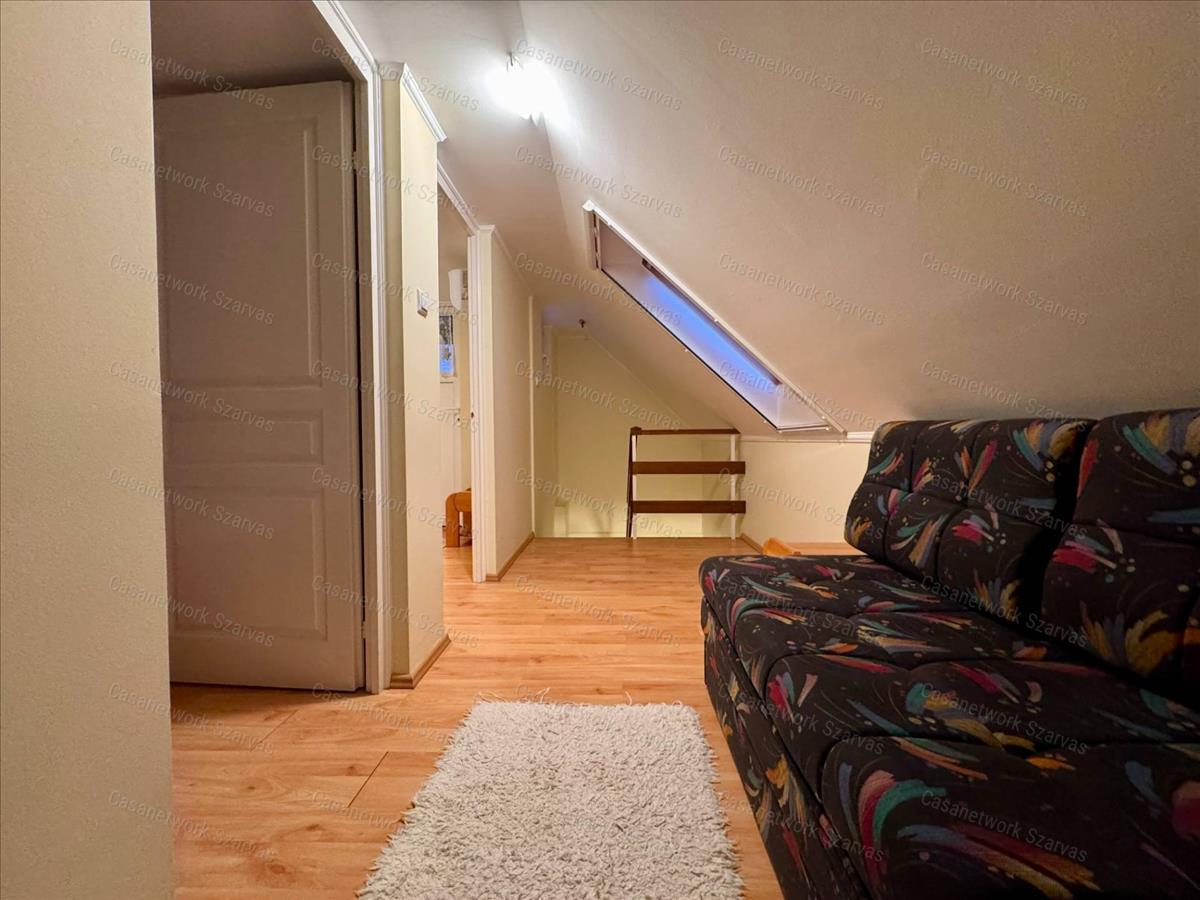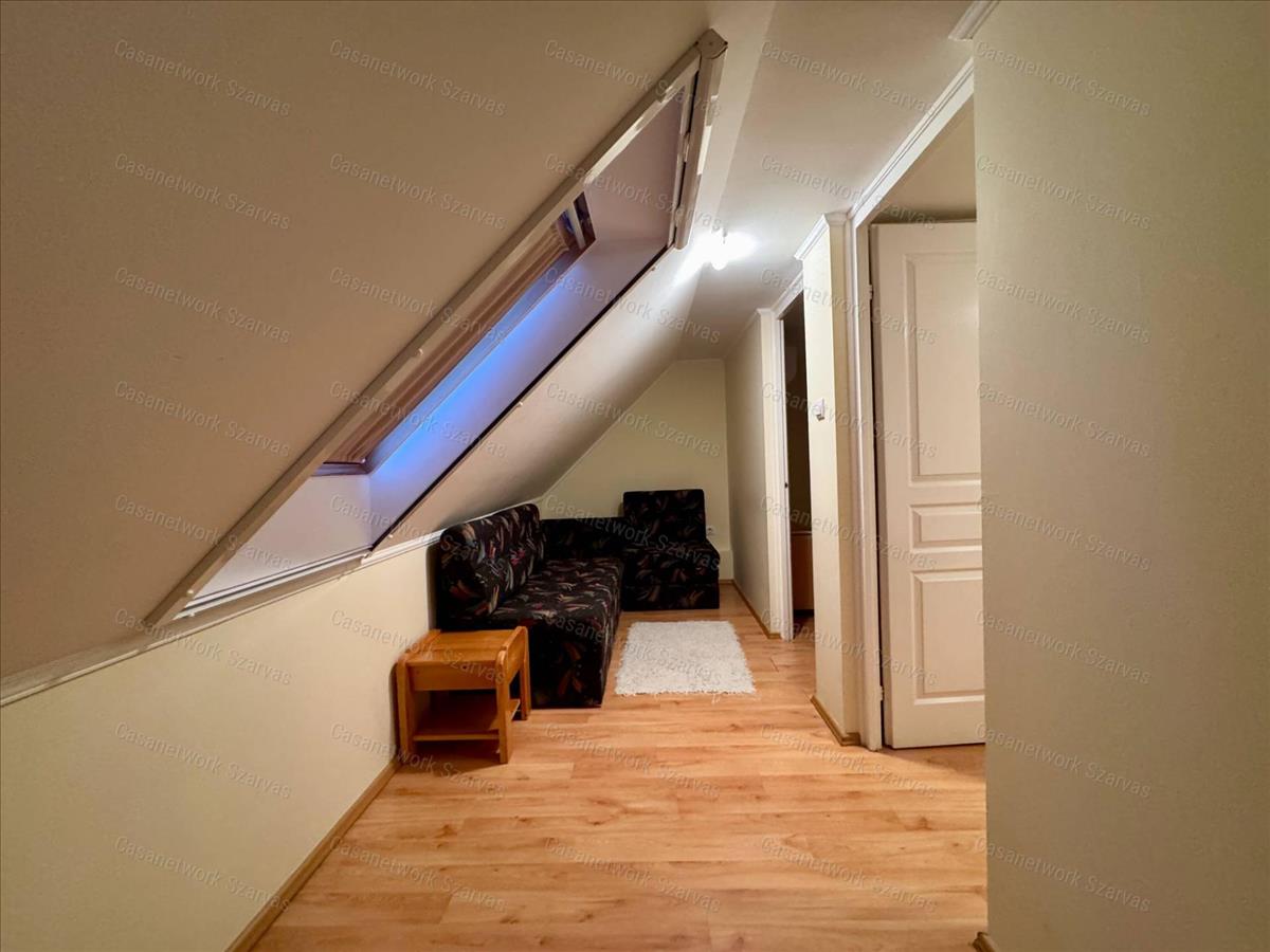 - Az ingatlan tetőterén folytatódik a lépcsőház, valamint kialakításra került egy előtér, két szoba és egy loggia szerkezet.