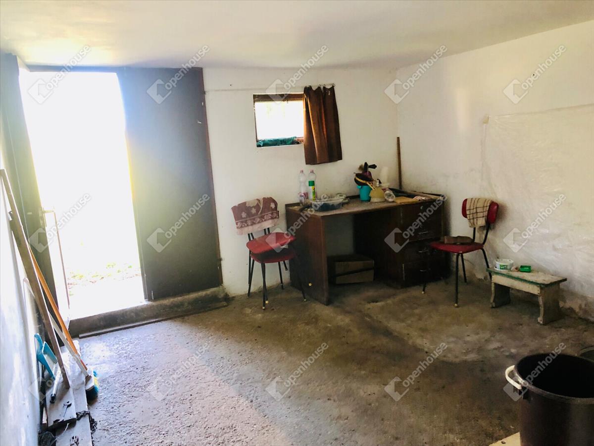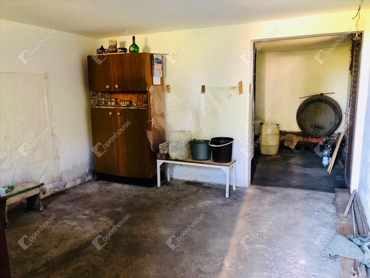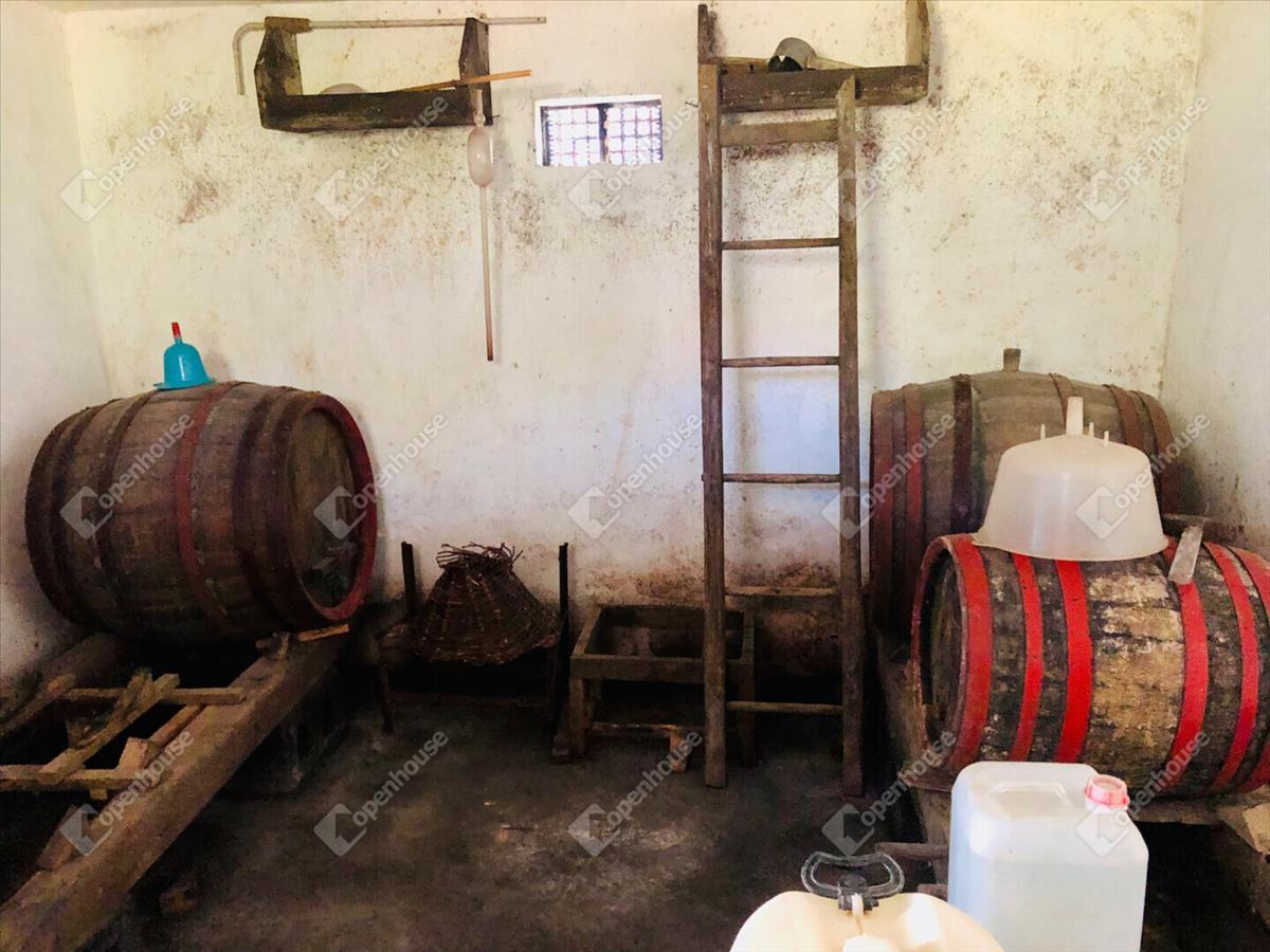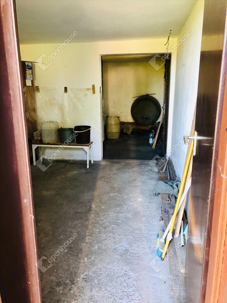 -Helyiségek 24m2 szuterénben borospince, tároló helyiség, 32m2 magasföldszinten szoba, konyha, spájz, terasz. Földszinten 12m2 tároló. Az öt helyrajzi számon levő telek területe összesen 6024m2.