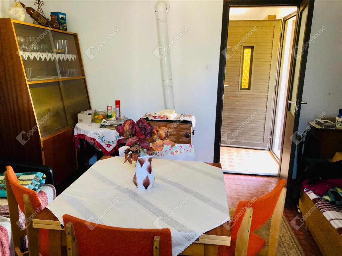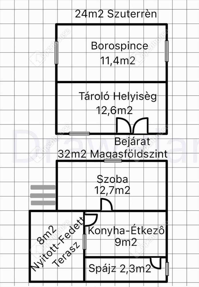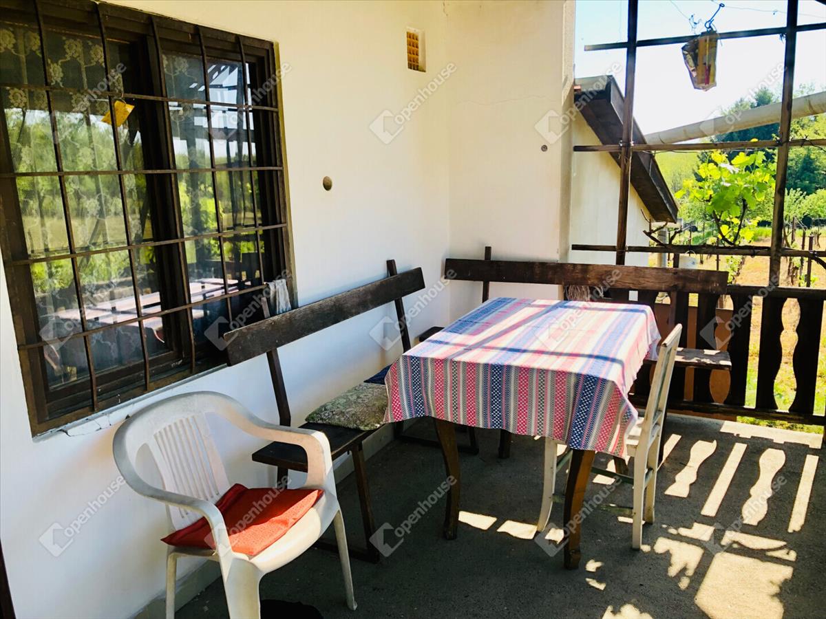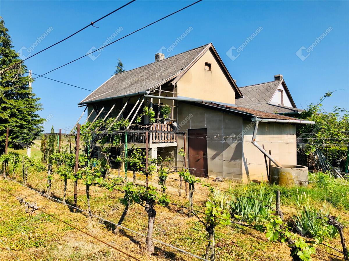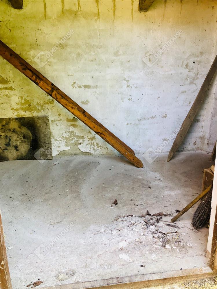 -Helyiségek 24m2 szuterénben borospince, tároló helyiség, 32m2 magasföldszinten szoba, konyha, spájz, terasz. Földszinten 12m2 tároló. Az öt helyrajzi számon levő telek területe összesen 6024m2.