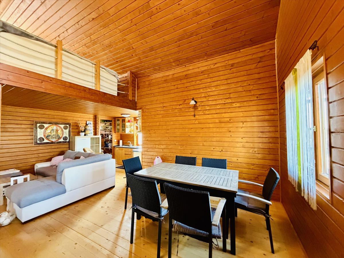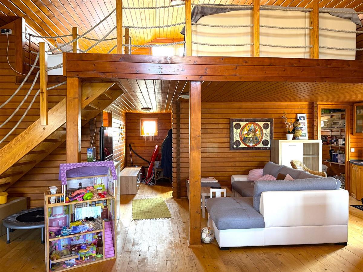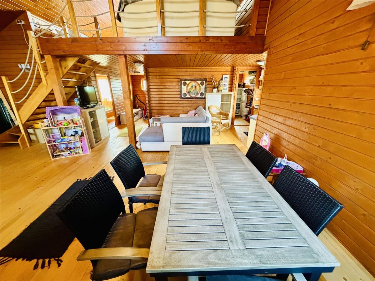 1 háló szoba, étkező-konyha-nappali, speiz, fürdő-wc, hatalmas galéria, elrendezésű faházat, egy hozzáépített 2, 4 m2-es tárolóval és egy 35 m2-es, terasszal és a teraszhoz kapcsolódó stéggel.